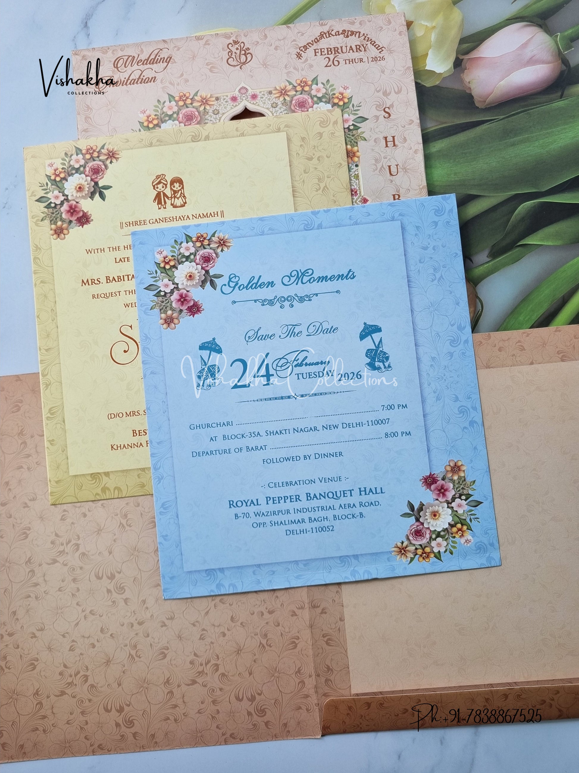 Vishakha Collections presents you beautiful luxury wedding invitation cards with all latest designs and the latest variety. Its just not a wedding invitation card but a beautiful feeling of love and relationship it carries for you. Beautifully printed and packed with a bundle of love. if you like it, dont think again, just go for it.If you are worrying about the quality of the product, send your doubts to us. We are here to help you. If you want in wholesale or bulk, dont forget to contact us.