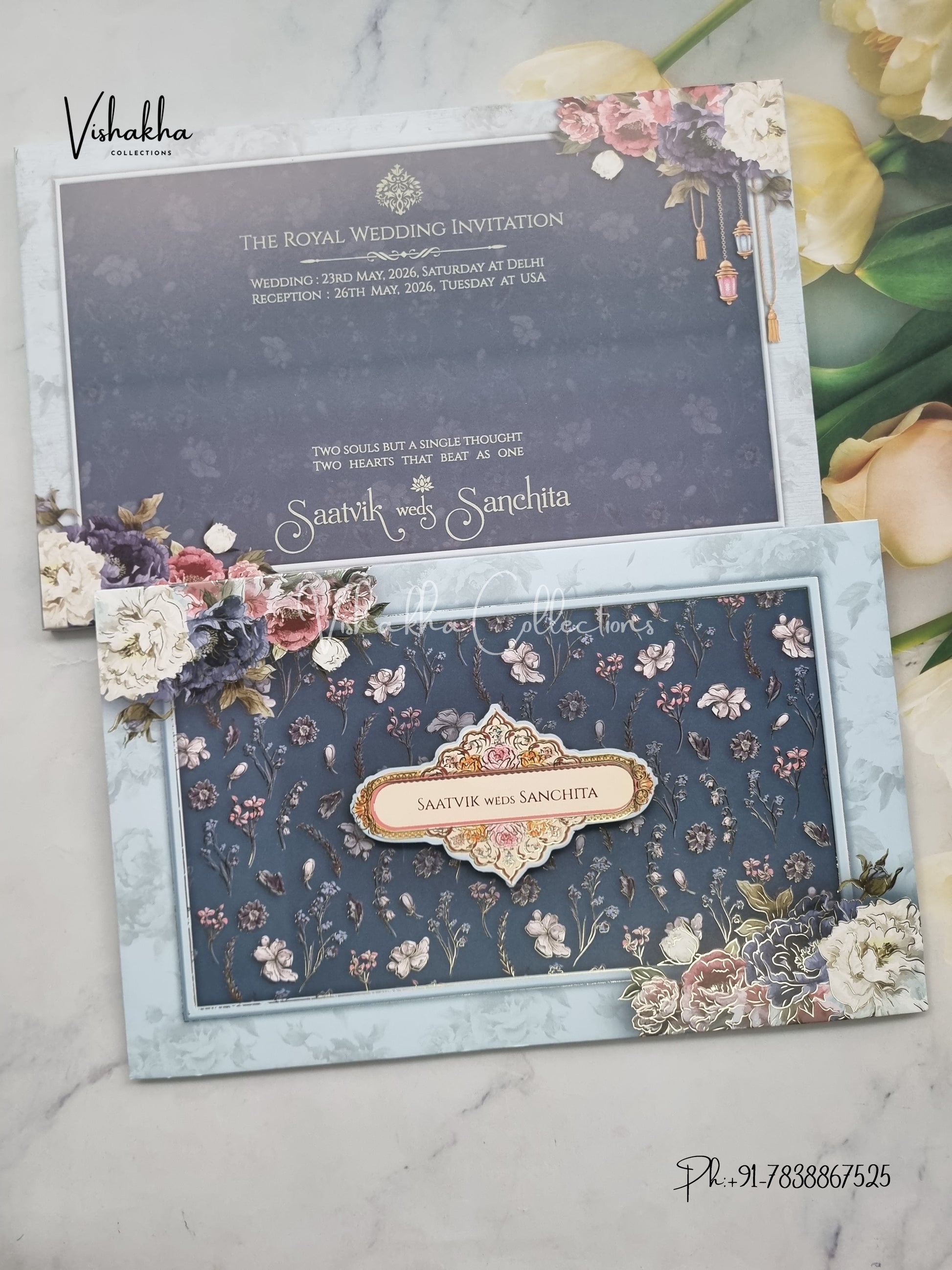 Vishakha Collections presents you beautiful luxury wedding invitation cards with all latest designs and the latest variety. Its just not a wedding invitation card but a beautiful feeling of love and relationship it carries for you. Beautifully printed and packed with a bundle of love. if you like it, dont think again, just go for it.If you are worrying about the quality of the product, send your doubts to us. We are here to help you. If you want in wholesale or bulk, dont forget to contact us.