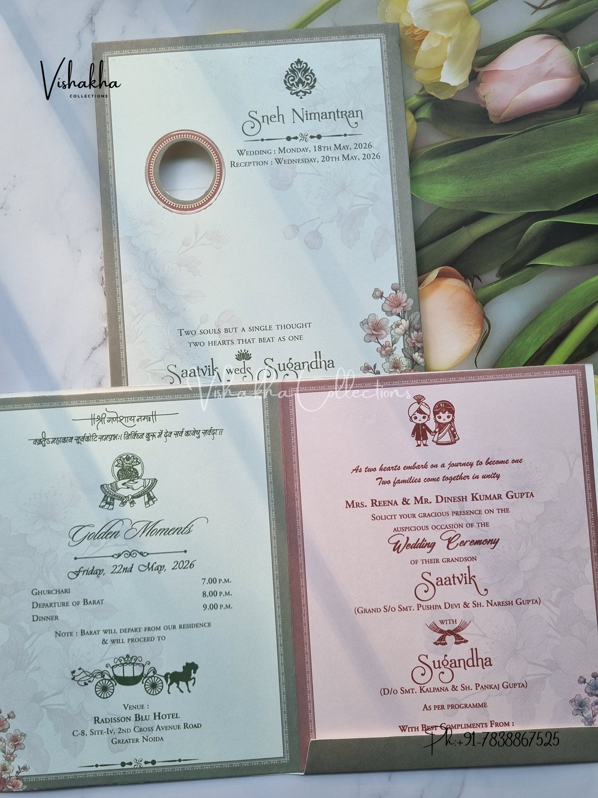 Vishakha Collections presents you beautiful luxury wedding invitation cards with all latest designs and the latest variety. Its just not a wedding invitation card but a beautiful feeling of love and relationship it carries for you. Beautifully printed and packed with a bundle of love. if you like it, dont think again, just go for it.If you are worrying about the quality of the product, send your doubts to us. We are here to help you. If you want in wholesale or bulk, dont forget to contact us.