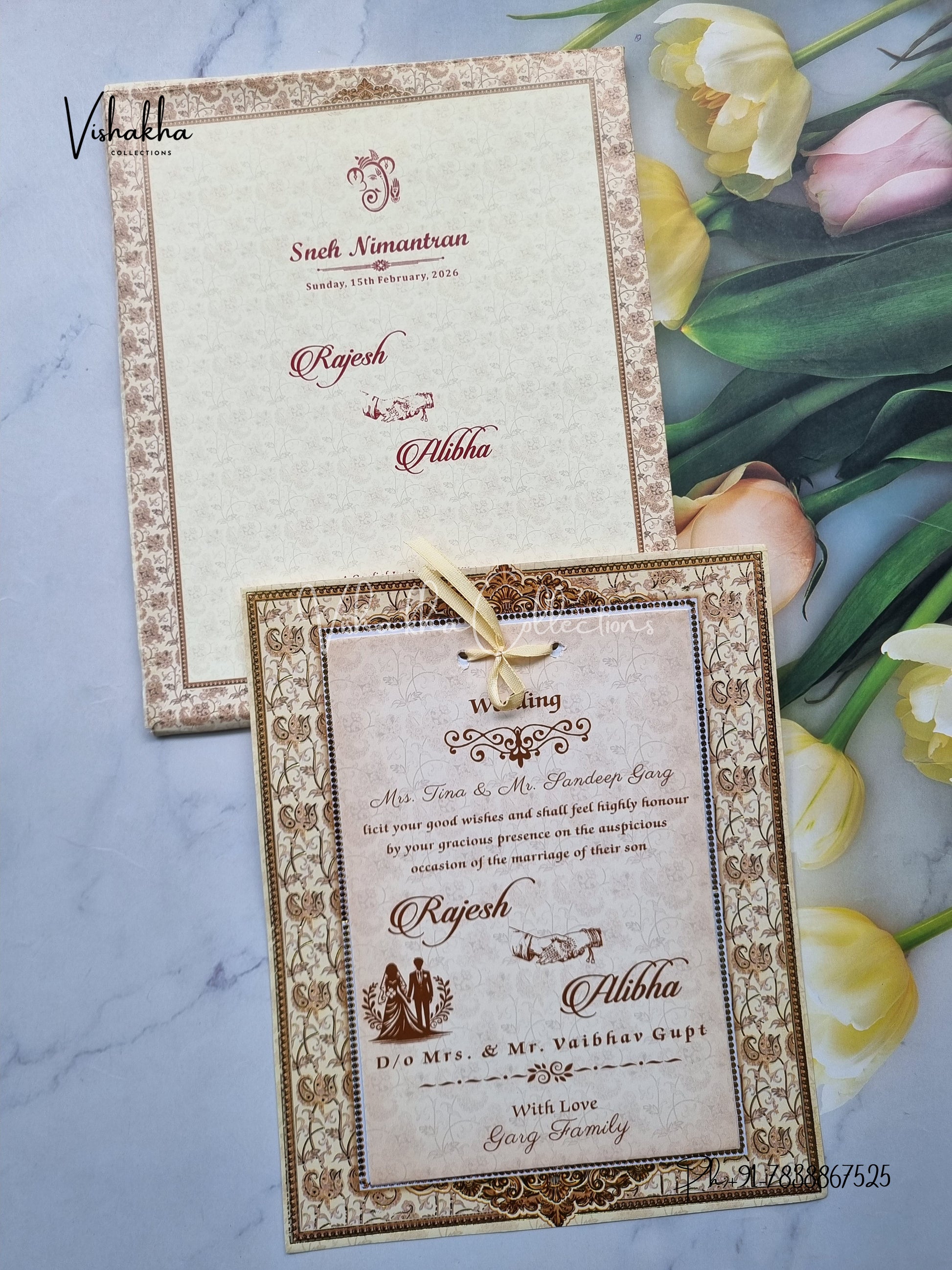 Vishakha Collections presents you beautiful luxury wedding invitation cards with all latest designs and the latest variety. Its just not a wedding invitation card but a beautiful feeling of love and relationship it carries for you. Beautifully printed and packed with a bundle of love. if you like it, dont think again, just go for it.If you are worrying about the quality of the product, send your doubts to us. We are here to help you. If you want in wholesale or bulk, dont forget to contact us.
