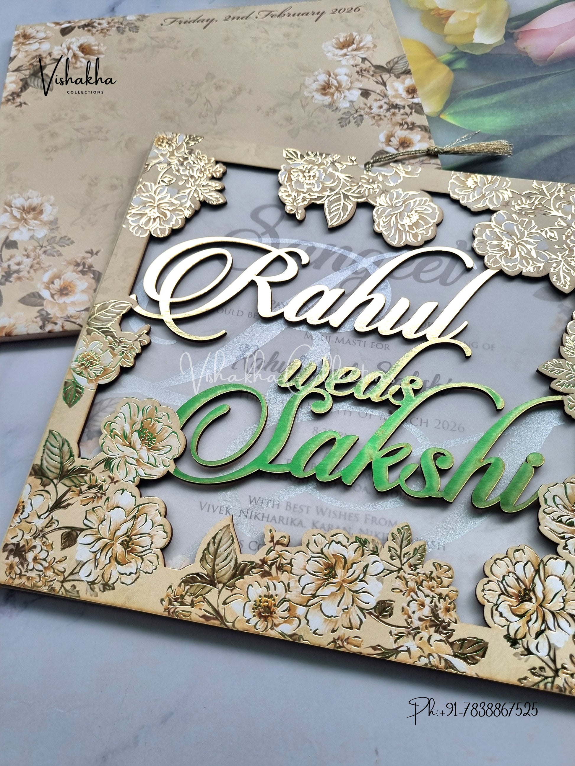 Semi Box Flower Hindu Muslim Christian Sikh Named MDF Laser Cut Vellum Paper muddy Colored invitation Cards SK-3293
