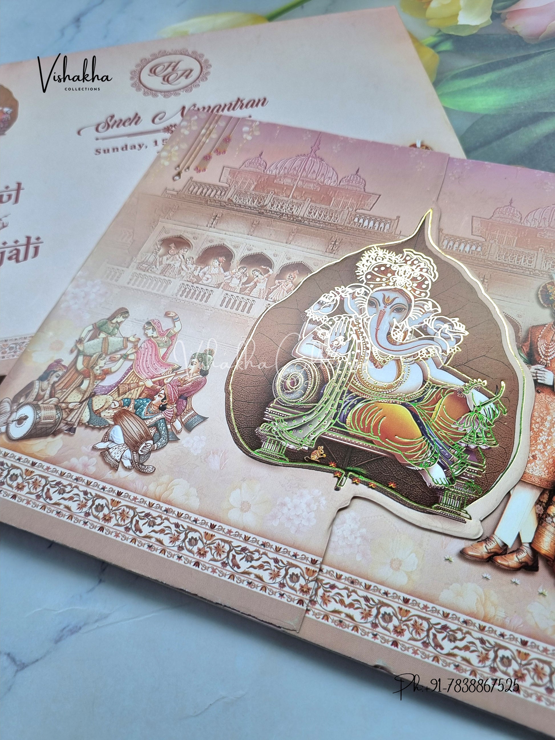Semi Box Ganesh Ji Dulah Dulhan Double Door Hindu Peach Pink Colored invitation Cards NA-1125-24