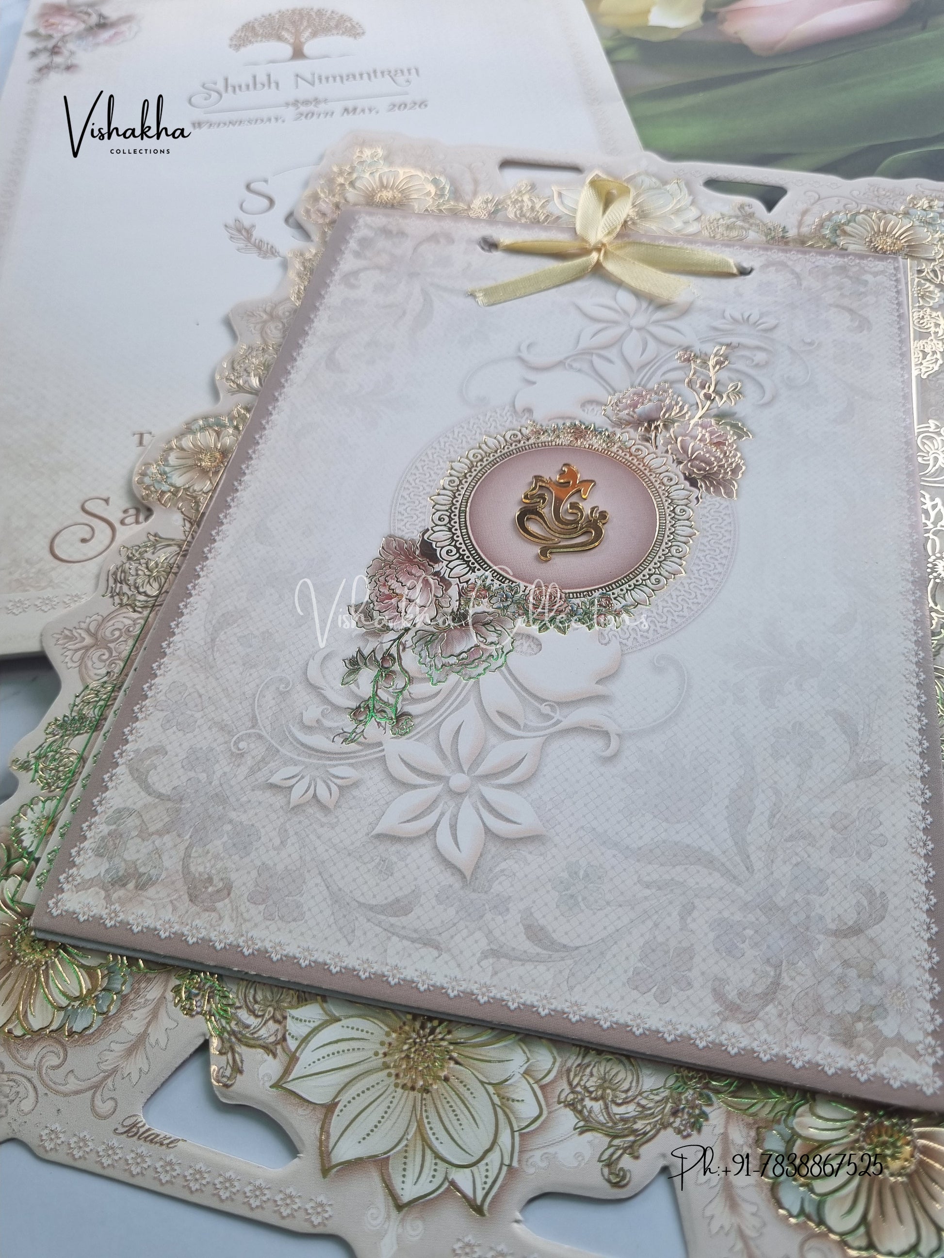 Vishakha Collections presents you beautiful luxury wedding invitation cards with all latest designs and the latest variety. Its just not a wedding invitation card but a beautiful feeling of love and relationship it carries for you. Beautifully printed and packed with a bundle of love. if you like it, dont think again, just go for it.If you are worrying about the quality of the product, send your doubts to us. We are here to help you. If you want in wholesale or bulk, dont forget to contact us.