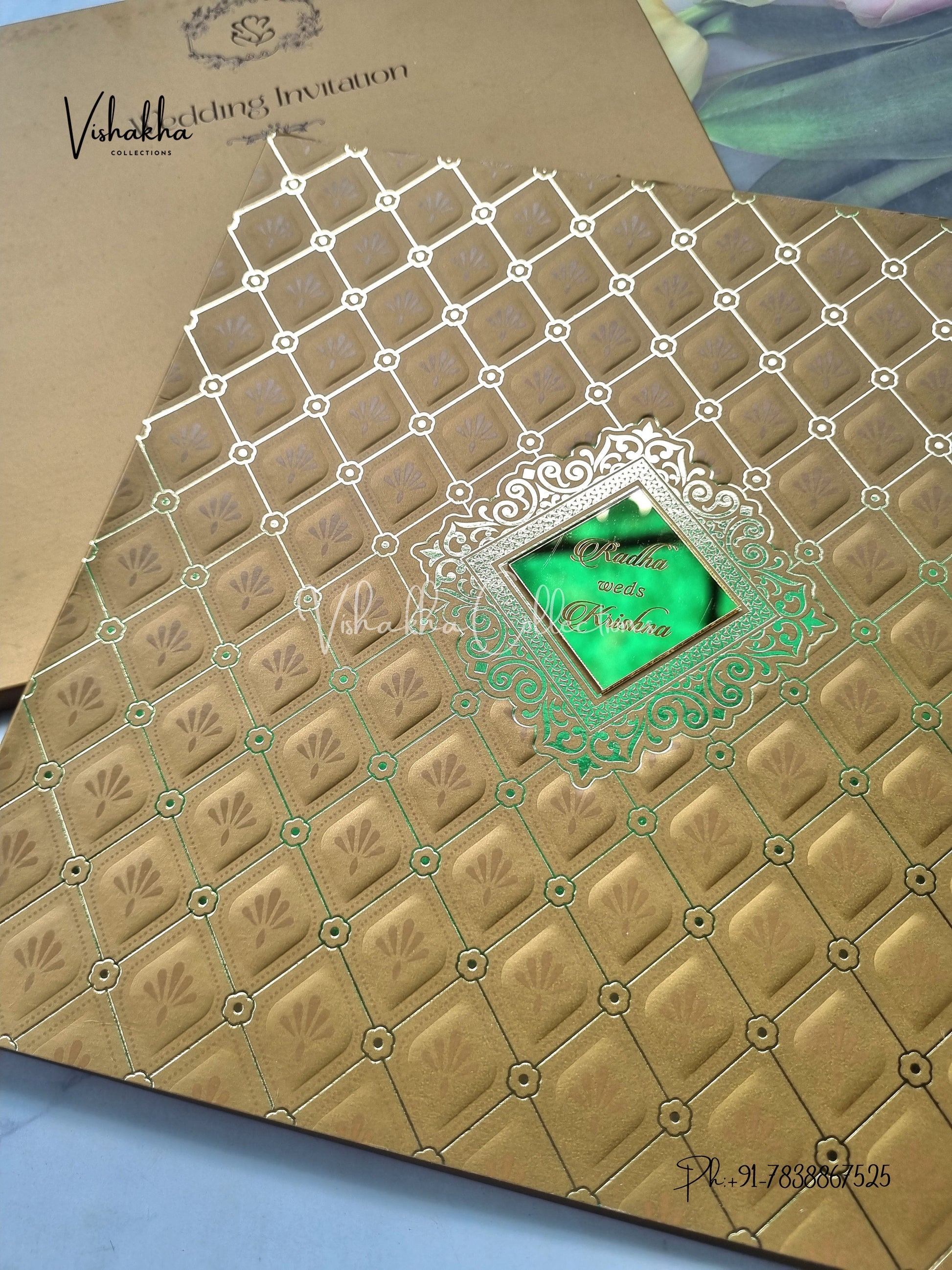 Vishakha Collections presents you beautiful luxury wedding invitation cards with all latest designs and the latest variety. Its just not a wedding invitation card but a beautiful feeling of love and relationship it carries for you. Beautifully printed and packed with a bundle of love. if you like it, dont think again, just go for it.If you are worrying about the quality of the product, send your doubts to us. We are here to help you. If you want in wholesale or bulk, dont forget to contact us.