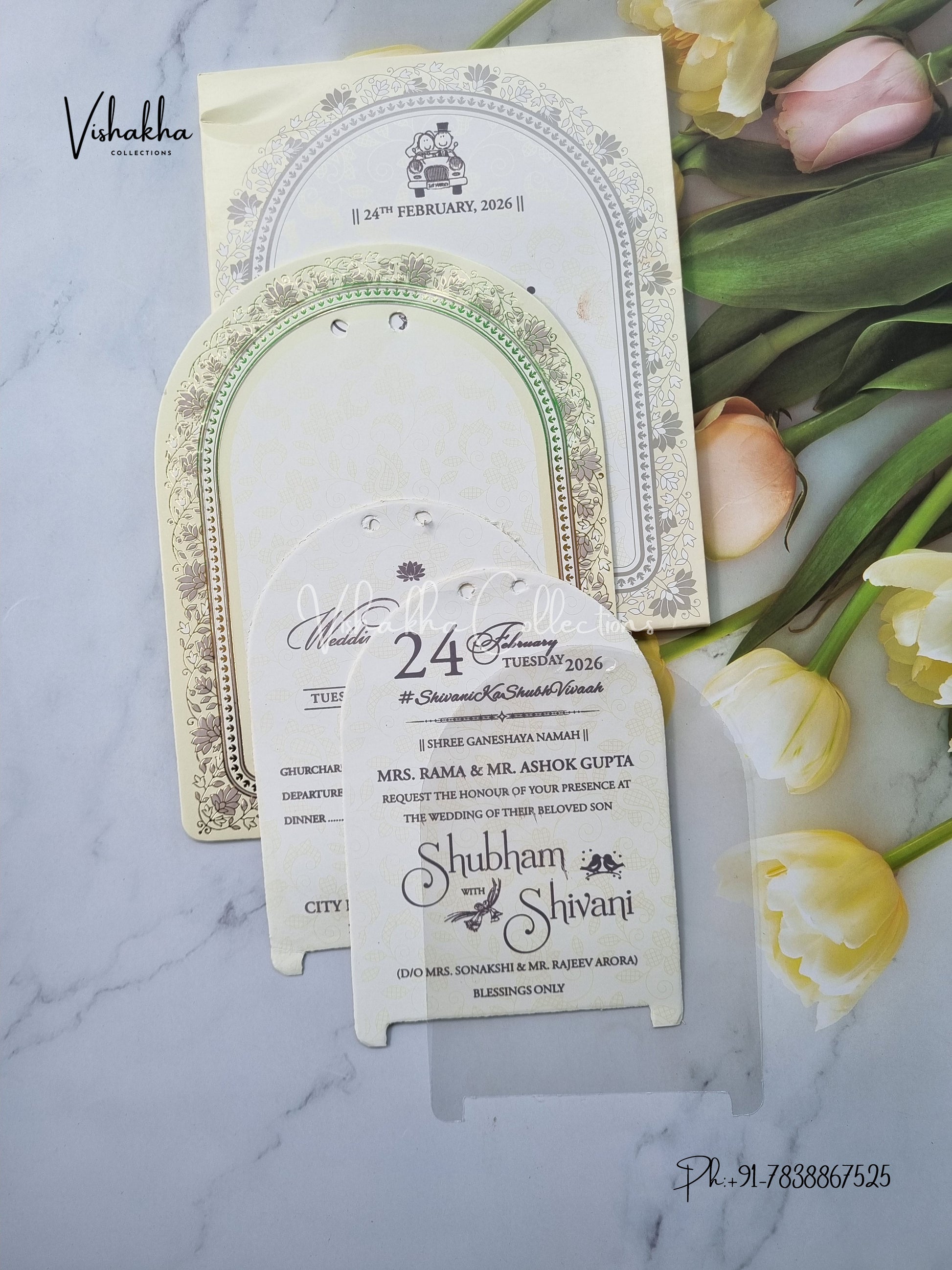Vishakha Collections presents you beautiful luxury wedding invitation cards with all latest designs and the latest variety. Its just not a wedding invitation card but a beautiful feeling of love and relationship it carries for you. Beautifully printed and packed with a bundle of love. if you like it, dont think again, just go for it.If you are worrying about the quality of the product, send your doubts to us. We are here to help you. If you want in wholesale or bulk, dont forget to contact us.