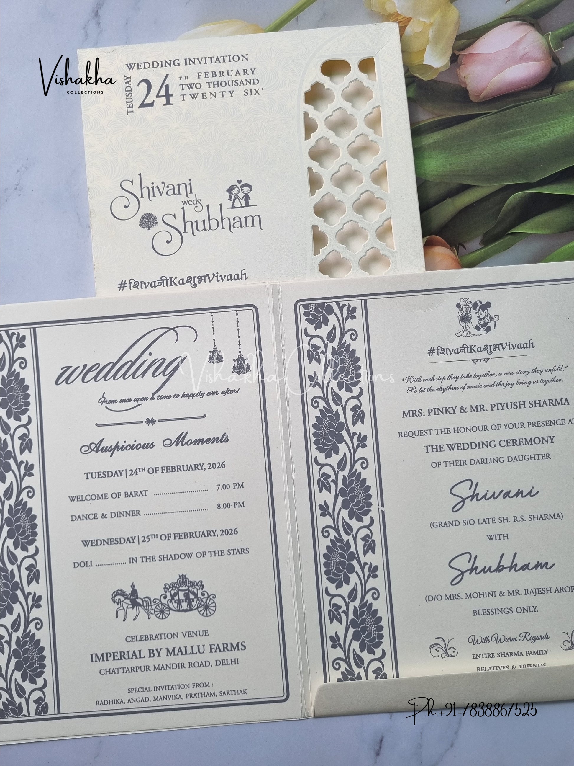 Vishakha Collections presents you beautiful luxury wedding invitation cards with all latest designs and the latest variety. Its just not a wedding invitation card but a beautiful feeling of love and relationship it carries for you. Beautifully printed and packed with a bundle of love. if you like it, dont think again, just go for it.If you are worrying about the quality of the product, send your doubts to us. We are here to help you. If you want in wholesale or bulk, dont forget to contact us.