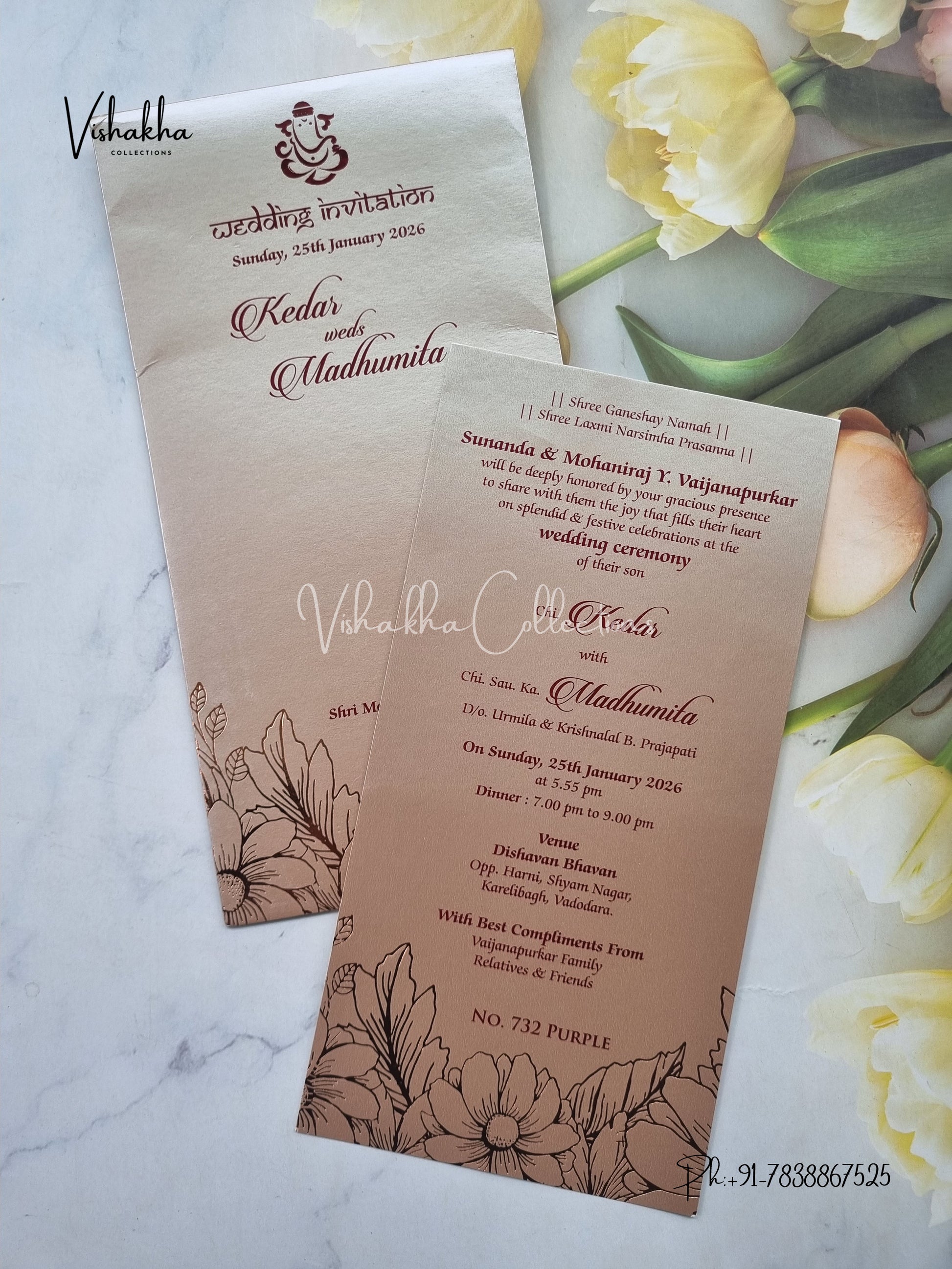 Vishakha Collections presents you beautiful luxury wedding invitation cards with all latest designs and the latest variety. Its just not a wedding invitation card but a beautiful feeling of love and relationship it carries for you. Beautifully printed and packed with a bundle of love. if you like it, dont think again, just go for it.If you are worrying about the quality of the product, send your doubts to us. We are here to help you. If you want in wholesale or bulk, dont forget to contact us.