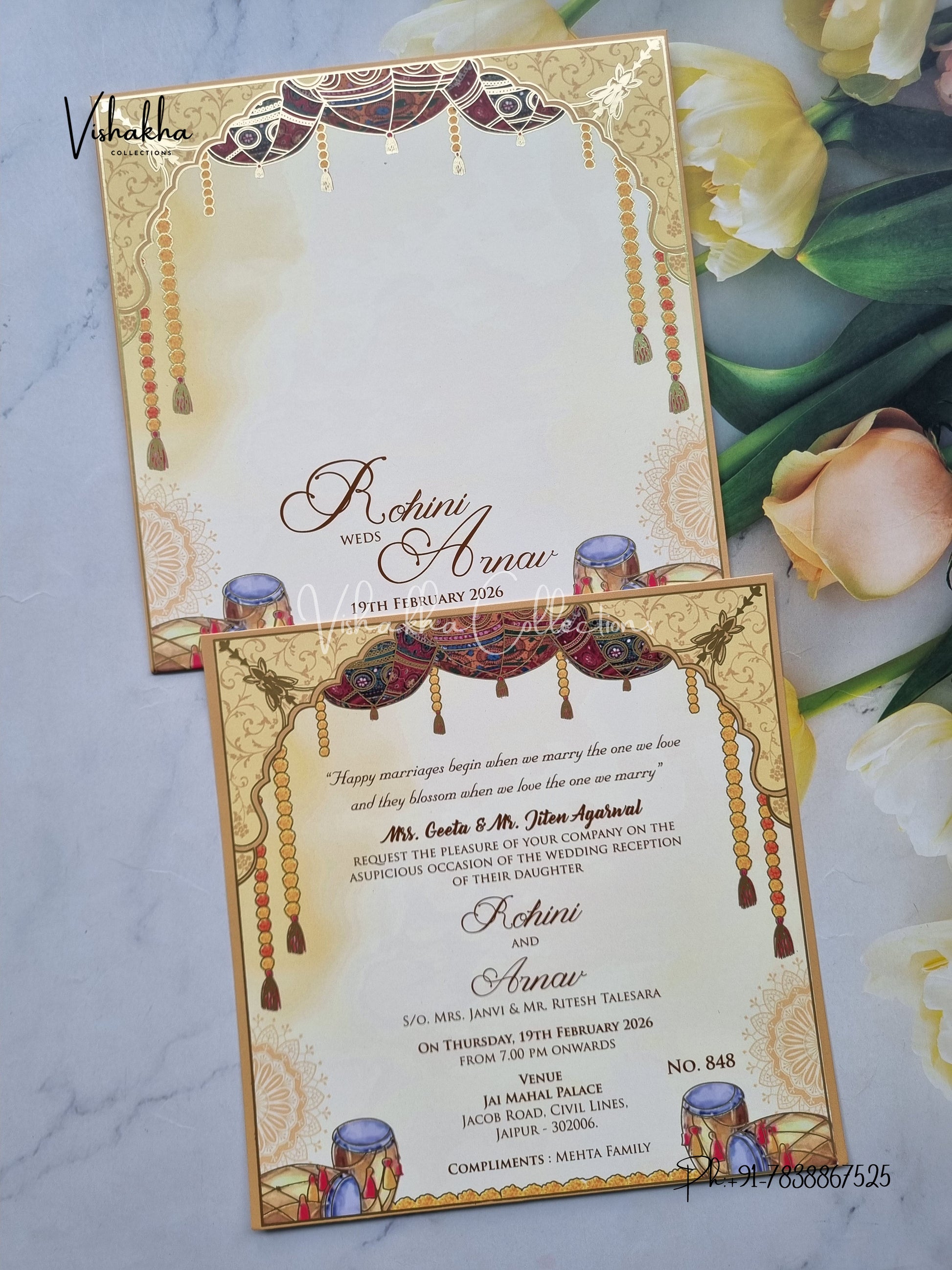 Vishakha Collections presents you beautiful luxury wedding invitation cards with all latest designs and the latest variety. Its just not a wedding invitation card but a beautiful feeling of love and relationship it carries for you. Beautifully printed and packed with a bundle of love. if you like it, dont think again, just go for it.If you are worrying about the quality of the product, send your doubts to us. We are here to help you. If you want in wholesale or bulk, dont forget to contact us.