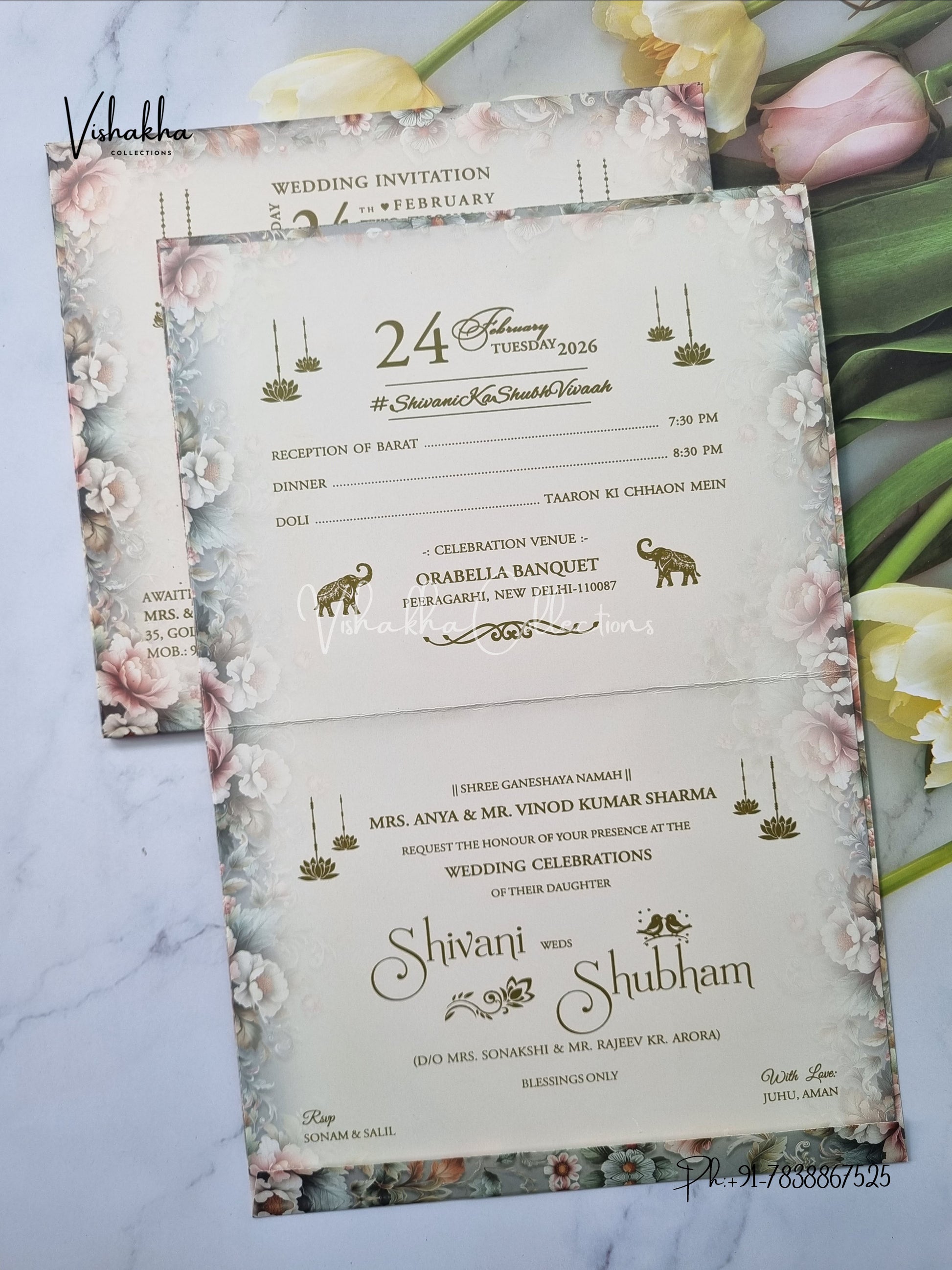Vishakha Collections presents you beautiful luxury wedding invitation cards with all latest designs and the latest variety. Its just not a wedding invitation card but a beautiful feeling of love and relationship it carries for you. Beautifully printed and packed with a bundle of love. if you like it, dont think again, just go for it.If you are worrying about the quality of the product, send your doubts to us. We are here to help you. If you want in wholesale or bulk, dont forget to contact us.