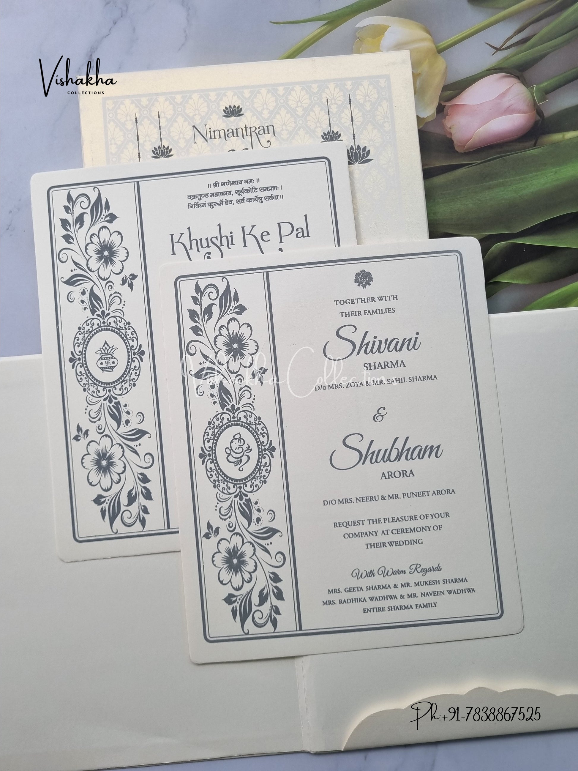 Vishakha Collections presents you beautiful luxury wedding invitation cards with all latest designs and the latest variety. Its just not a wedding invitation card but a beautiful feeling of love and relationship it carries for you. Beautifully printed and packed with a bundle of love. if you like it, dont think again, just go for it.If you are worrying about the quality of the product, send your doubts to us. We are here to help you. If you want in wholesale or bulk, dont forget to contact us.