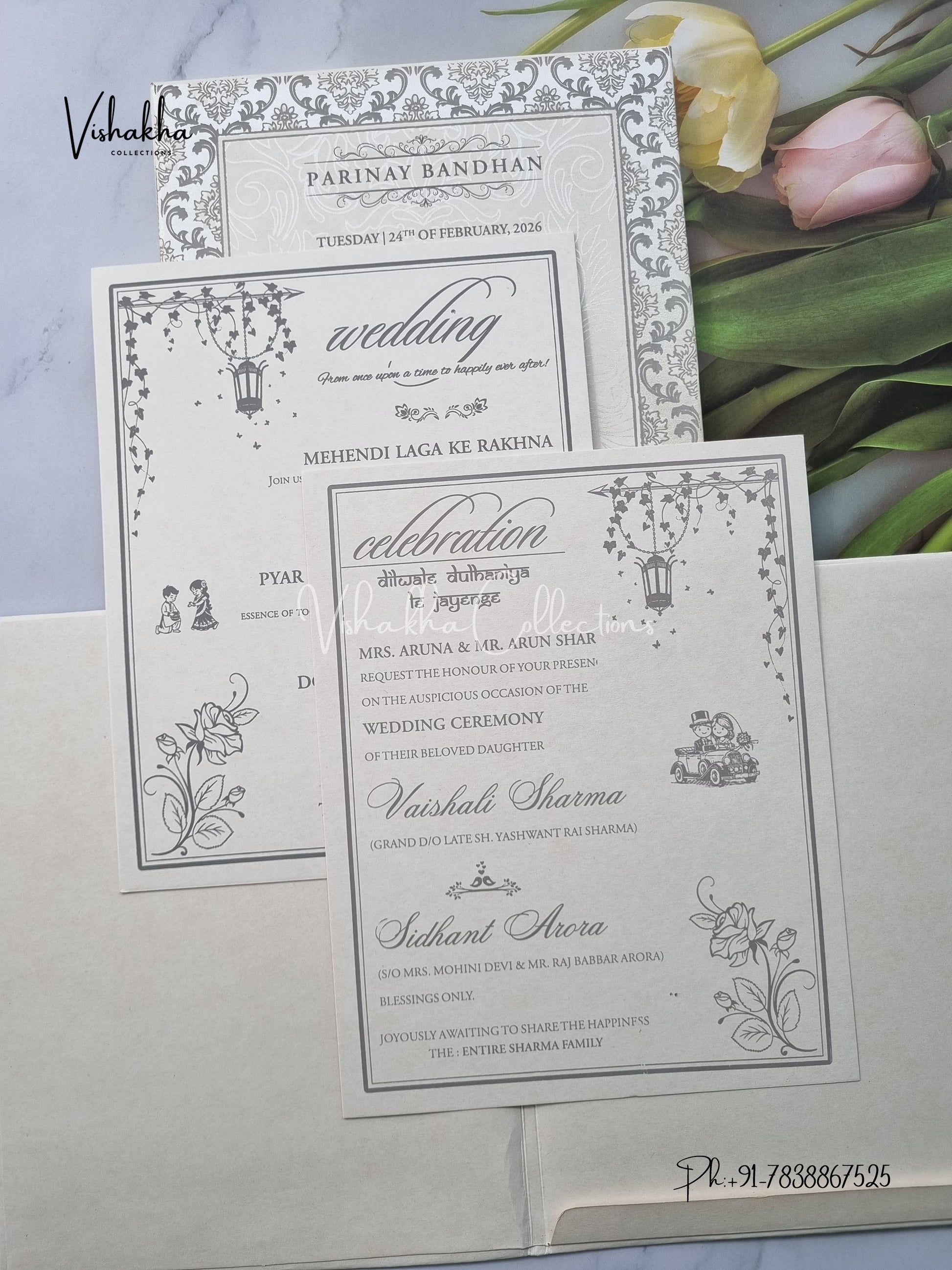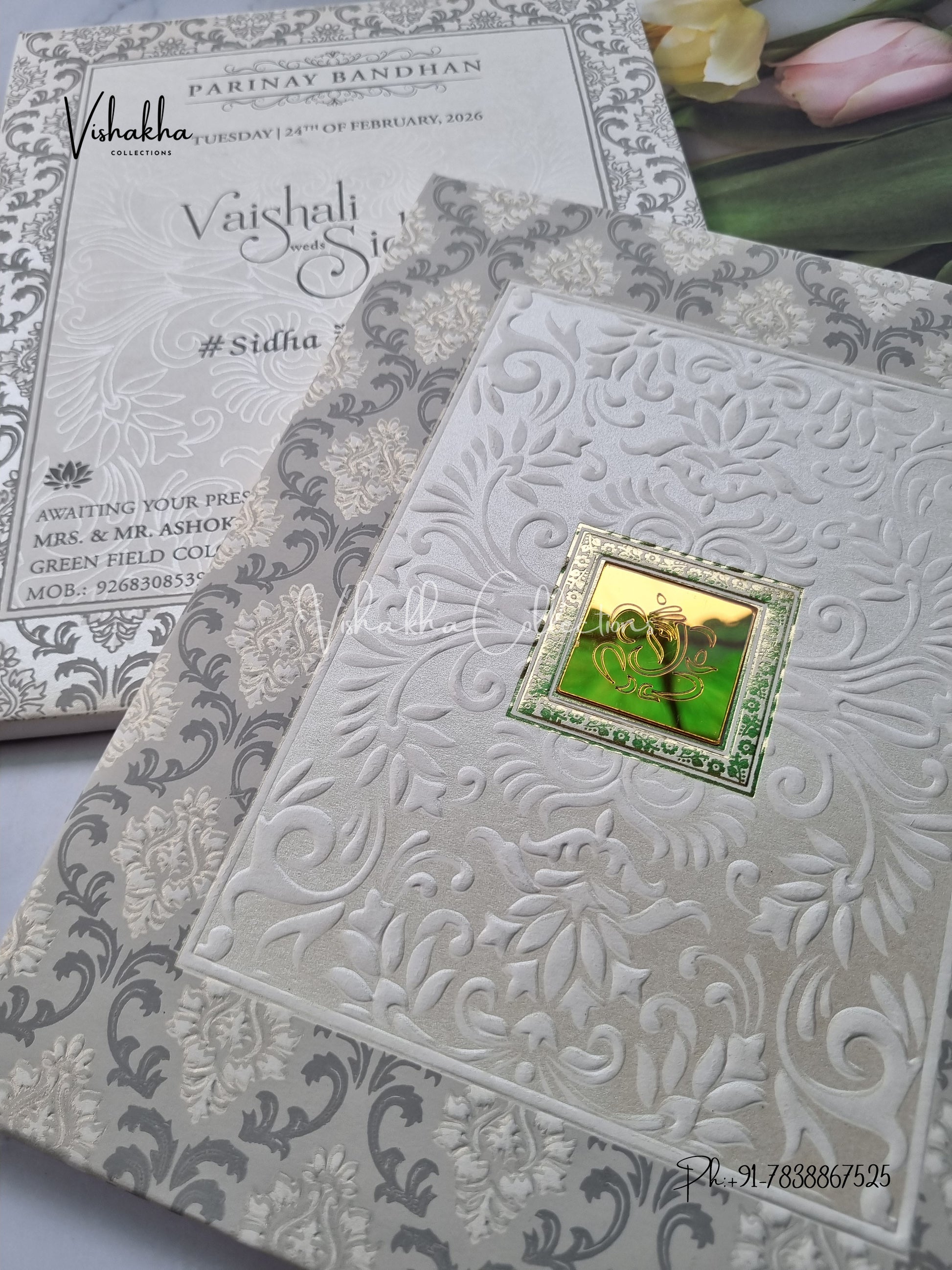 Vishakha Collections presents you beautiful luxury wedding invitation cards with all latest designs and the latest variety. Its just not a wedding invitation card but a beautiful feeling of love and relationship it carries for you. Beautifully printed and packed with a bundle of love. if you like it, dont think again, just go for it.If you are worrying about the quality of the product, send your doubts to us. We are here to help you. If you want in wholesale or bulk, dont forget to contact us.