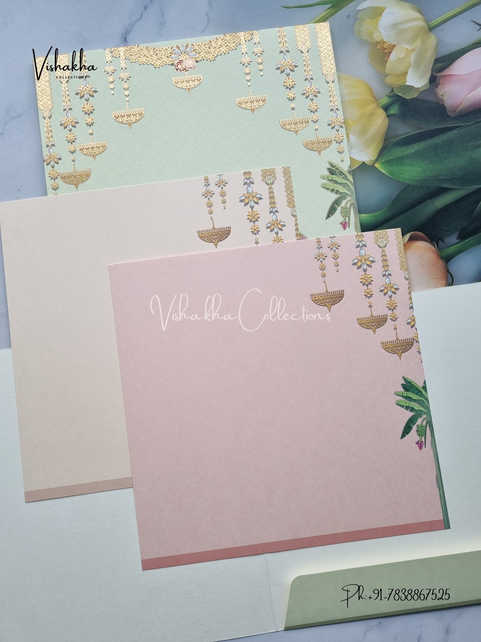 Vishakha Collections presents you beautiful luxury wedding invitation cards with all latest designs and the latest variety. Its just not a wedding invitation card but a beautiful feeling of love and relationship it carries for you. Beautifully printed and packed with a bundle of love. if you like it, dont think again, just go for it.If you are worrying about the quality of the product, send your doubts to us. We are here to help you. If you want in wholesale or bulk, dont forget to contact us.
