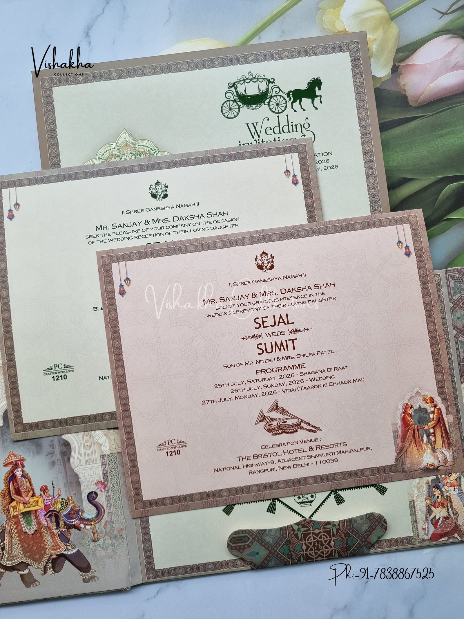 Vishakha Collections presents you beautiful luxury wedding invitation cards with all latest designs and the latest variety. Its just not a wedding invitation card but a beautiful feeling of love and relationship it carries for you. Beautifully printed and packed with a bundle of love. if you like it, dont think again, just go for it.If you are worrying about the quality of the product, send your doubts to us. We are here to help you. If you want in wholesale or bulk, dont forget to contact us.