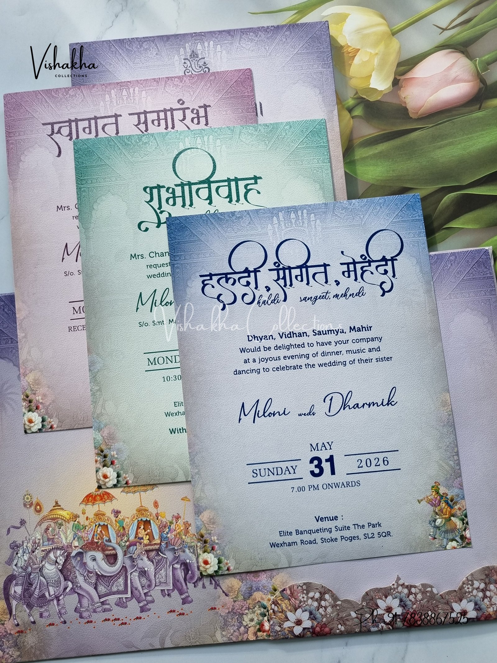 Vishakha Collections presents you beautiful luxury wedding invitation cards with all latest designs and the latest variety. Its just not a wedding invitation card but a beautiful feeling of love and relationship it carries for you. Beautifully printed and packed with a bundle of love. if you like it, dont think again, just go for it.If you are worrying about the quality of the product, send your doubts to us. We are here to help you. If you want in wholesale or bulk, dont forget to contact us.