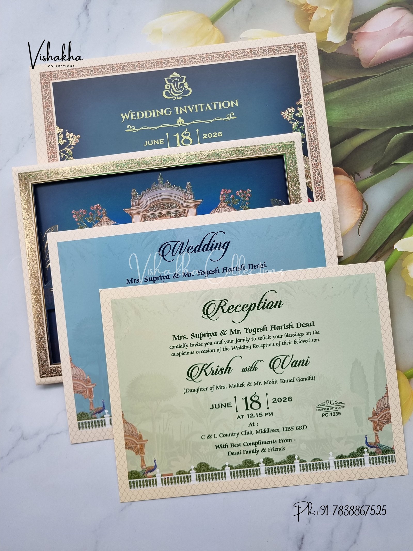 Vishakha Collections presents you beautiful luxury wedding invitation cards with all latest designs and the latest variety. Its just not a wedding invitation card but a beautiful feeling of love and relationship it carries for you. Beautifully printed and packed with a bundle of love. if you like it, dont think again, just go for it.If you are worrying about the quality of the product, send your doubts to us. We are here to help you. If you want in wholesale or bulk, dont forget to contact us.