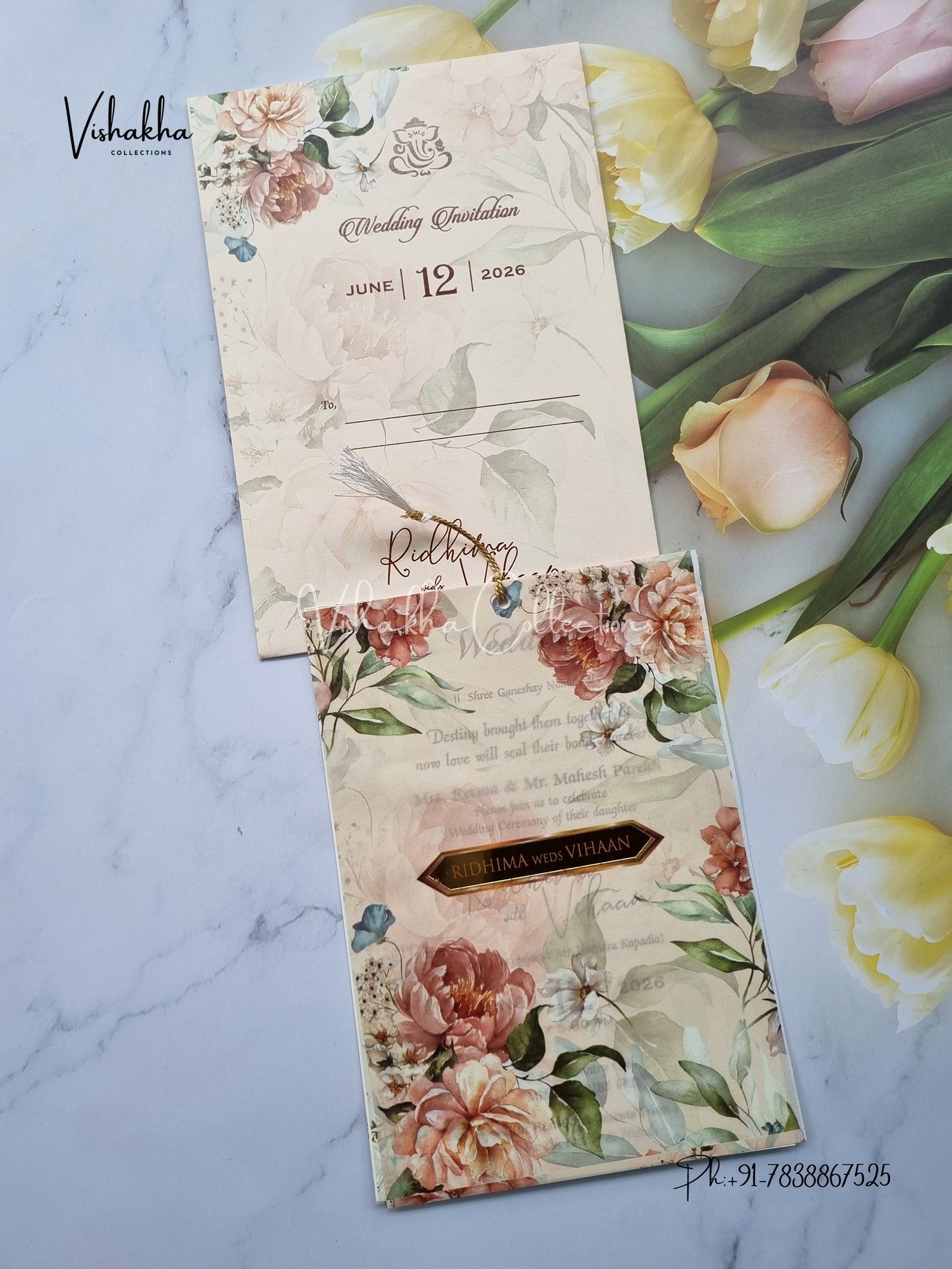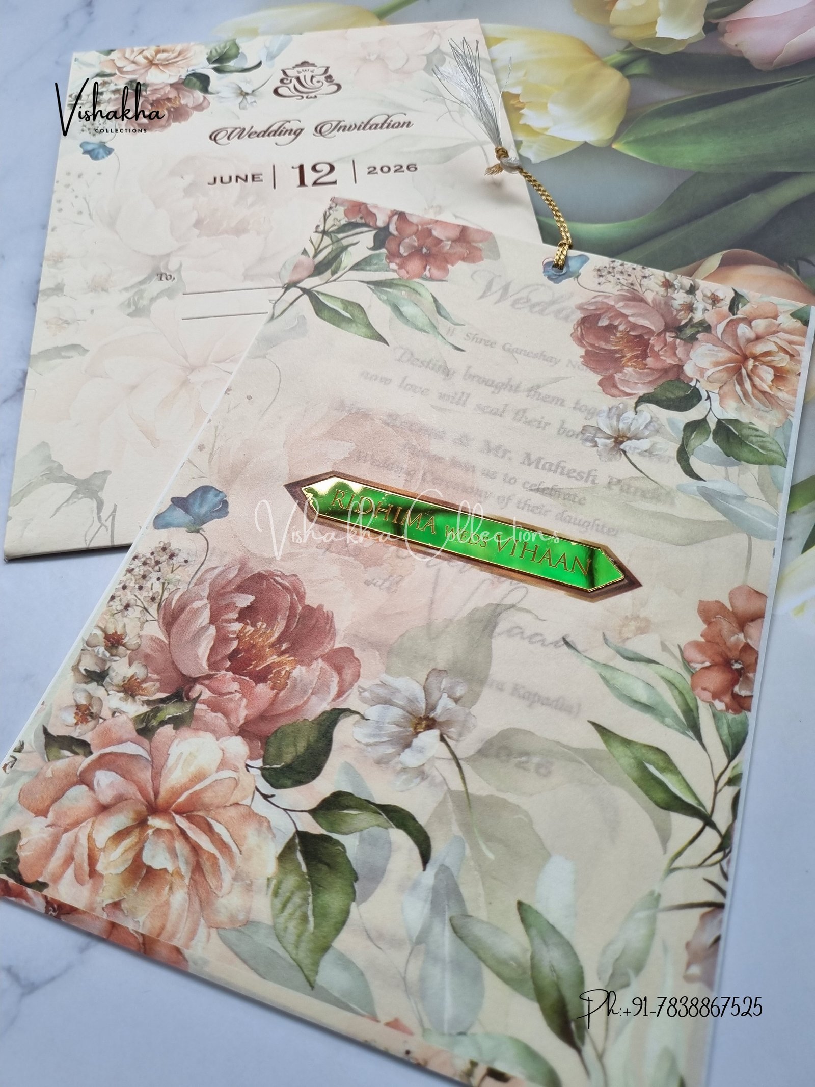 Vishakha Collections presents you beautiful luxury wedding invitation cards with all latest designs and the latest variety. Its just not a wedding invitation card but a beautiful feeling of love and relationship it carries for you. Beautifully printed and packed with a bundle of love. if you like it, dont think again, just go for it.If you are worrying about the quality of the product, send your doubts to us. We are here to help you. If you want in wholesale or bulk, dont forget to contact us.
