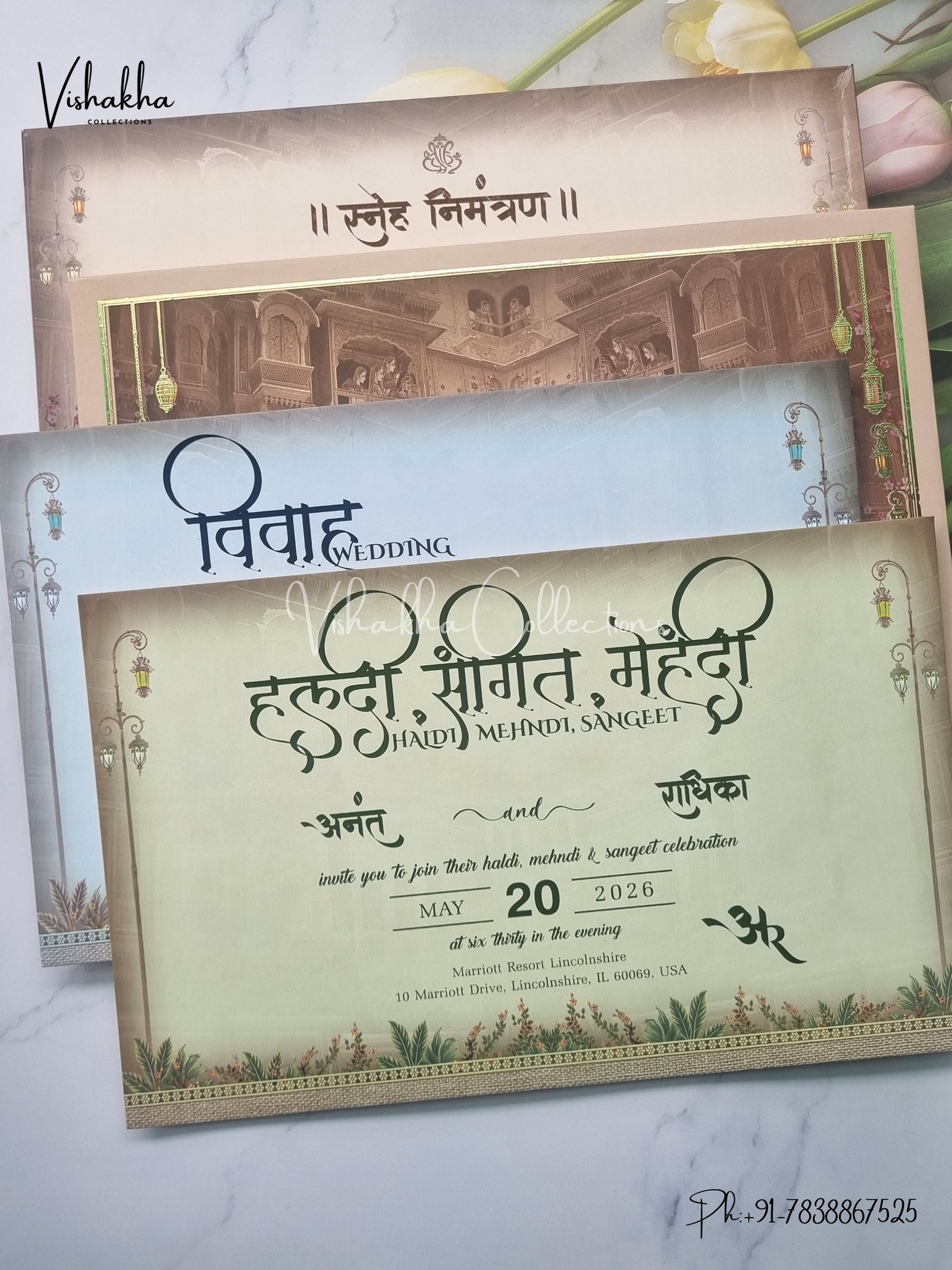 Vishakha Collections presents you beautiful luxury wedding invitation cards with all latest designs and the latest variety. Its just not a wedding invitation card but a beautiful feeling of love and relationship it carries for you. Beautifully printed and packed with a bundle of love. if you like it, dont think again, just go for it.If you are worrying about the quality of the product, send your doubts to us. We are here to help you. If you want in wholesale or bulk, dont forget to contact us.