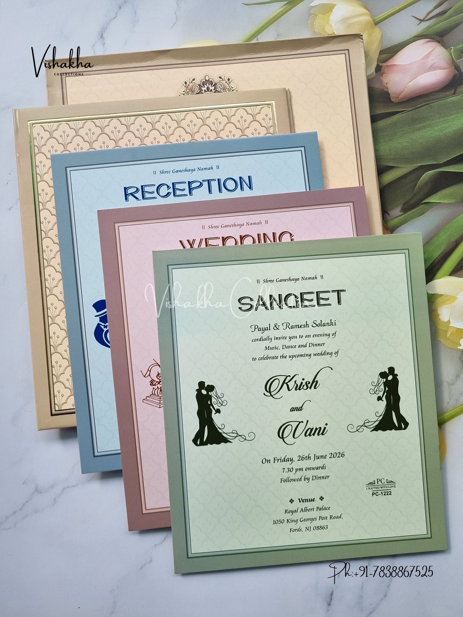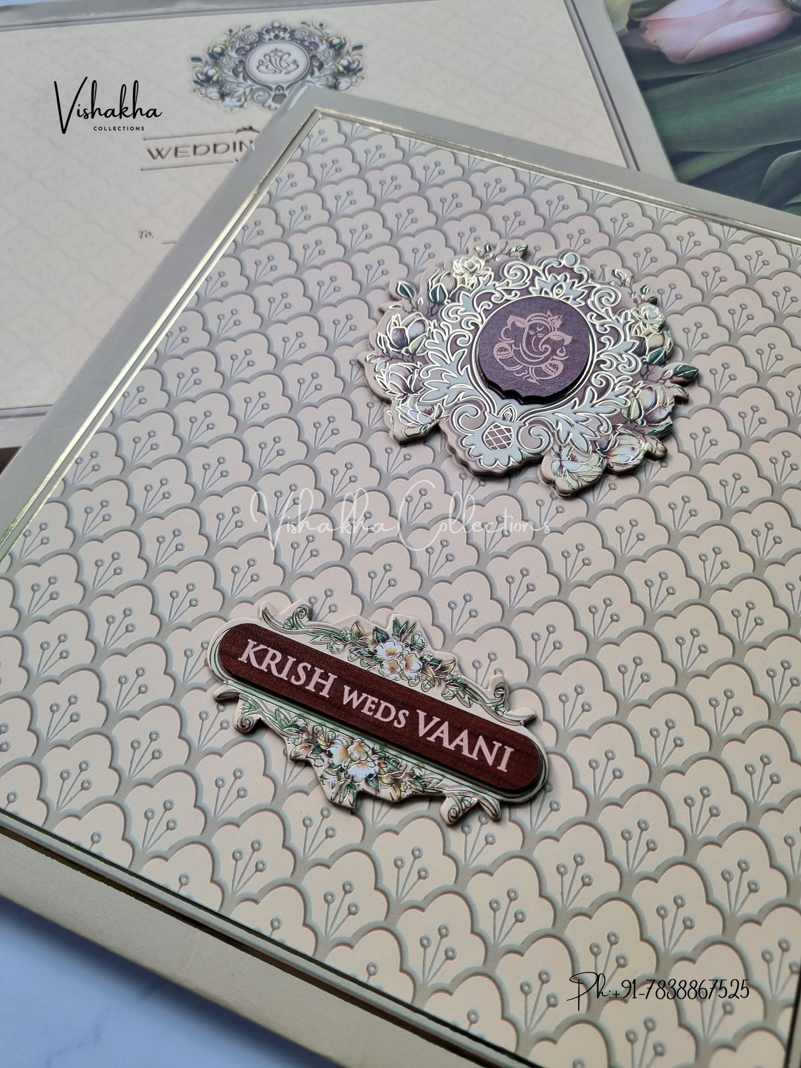 Vishakha Collections presents you beautiful luxury wedding invitation cards with all latest designs and the latest variety. Its just not a wedding invitation card but a beautiful feeling of love and relationship it carries for you. Beautifully printed and packed with a bundle of love. if you like it, dont think again, just go for it.If you are worrying about the quality of the product, send your doubts to us. We are here to help you. If you want in wholesale or bulk, dont forget to contact us.