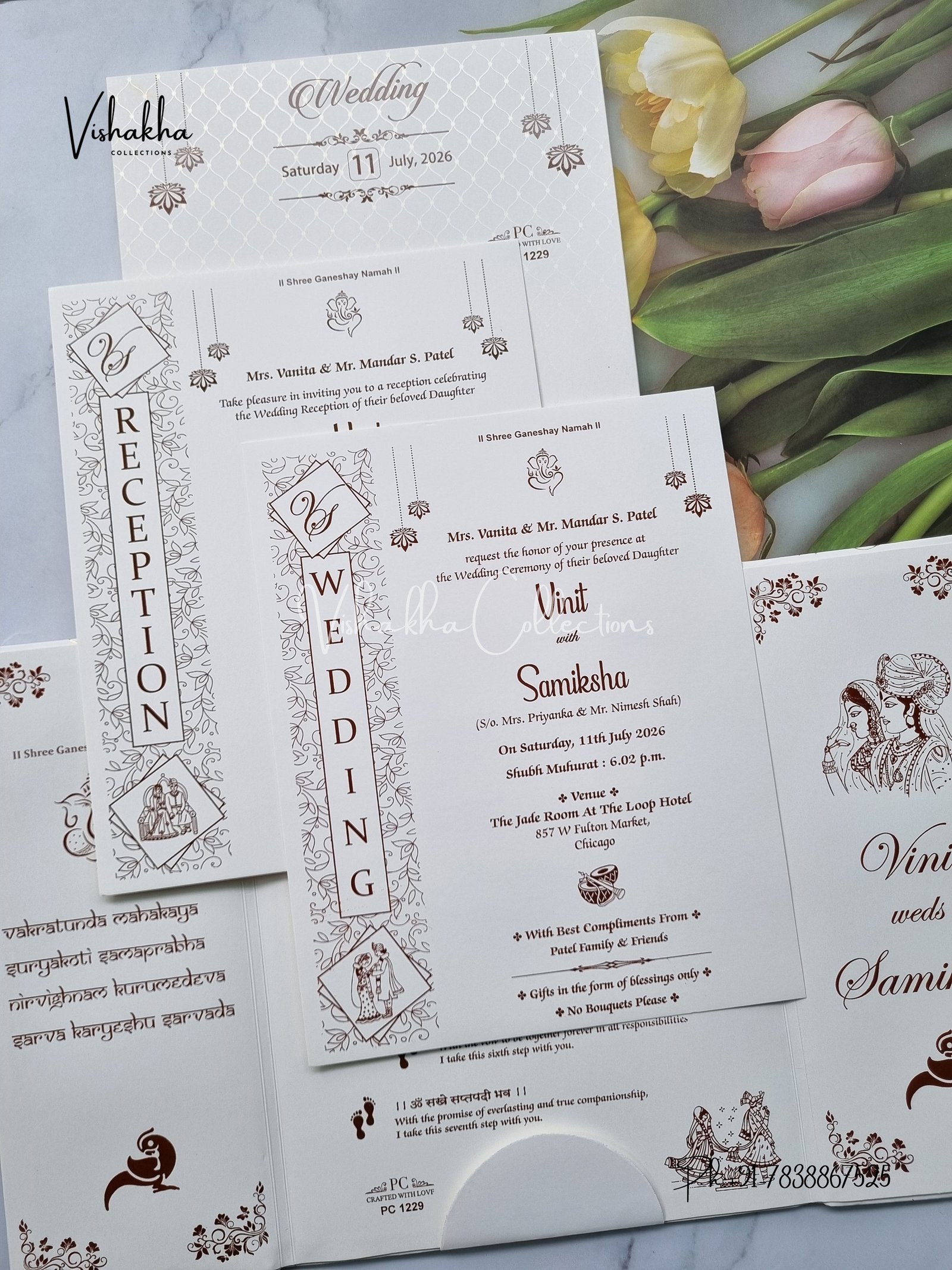 Vishakha Collections presents you beautiful luxury wedding invitation cards with all latest designs and the latest variety. Its just not a wedding invitation card but a beautiful feeling of love and relationship it carries for you. Beautifully printed and packed with a bundle of love. if you like it, dont think again, just go for it.If you are worrying about the quality of the product, send your doubts to us. We are here to help you. If you want in wholesale or bulk, dont forget to contact us.