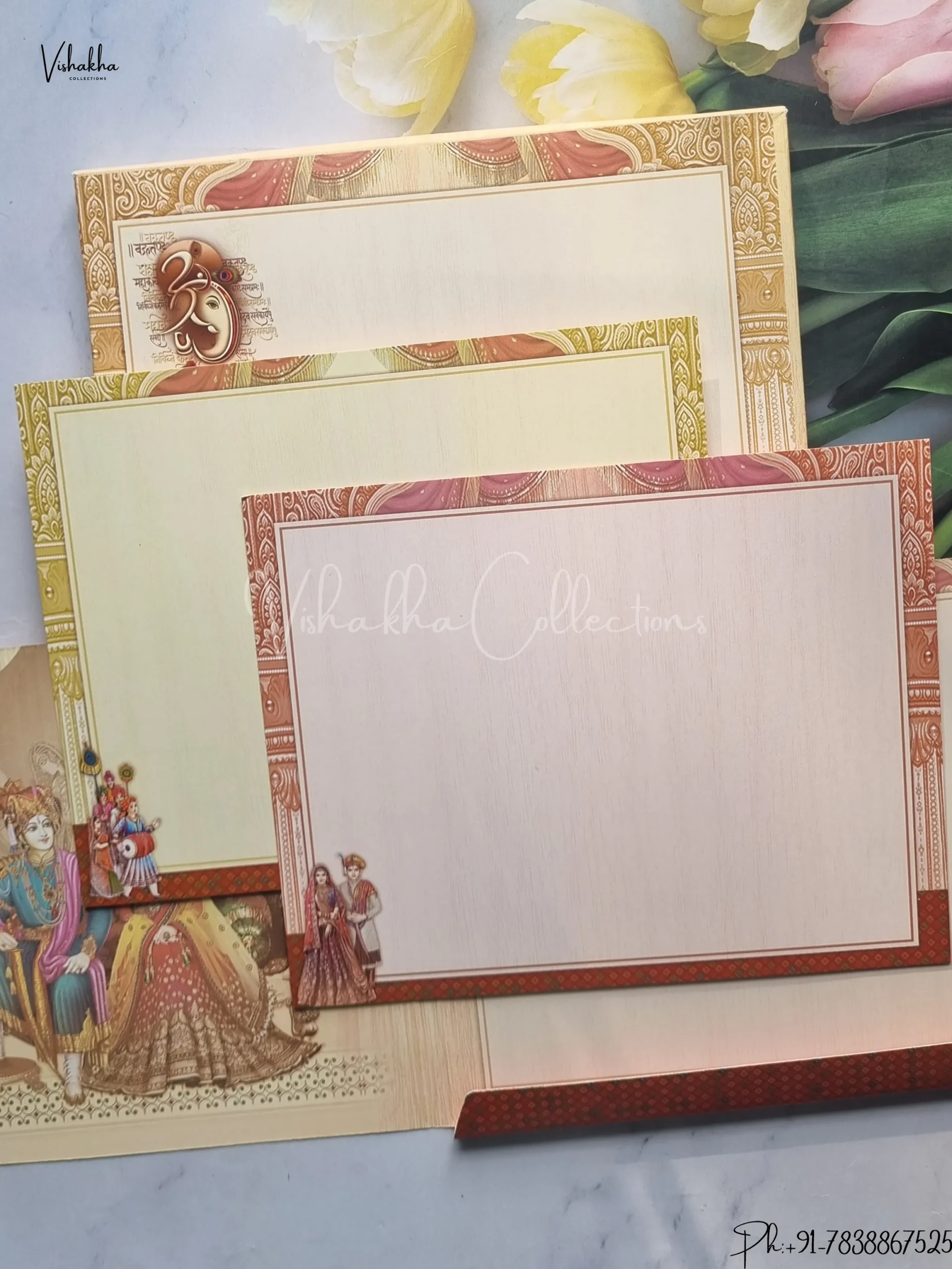 Vishakha Collections presents you beautiful luxury wedding invitation cards with all latest designs and the latest variety. Its just not a wedding invitation card but a beautiful feeling of love and relationship it carries for you. Beautifully printed and packed with a bundle of love. if you like it, dont think again, just go for it.If you are worrying about the quality of the product, send your doubts to us. We are here to help you. If you want in wholesale or bulk, dont forget to contact us.