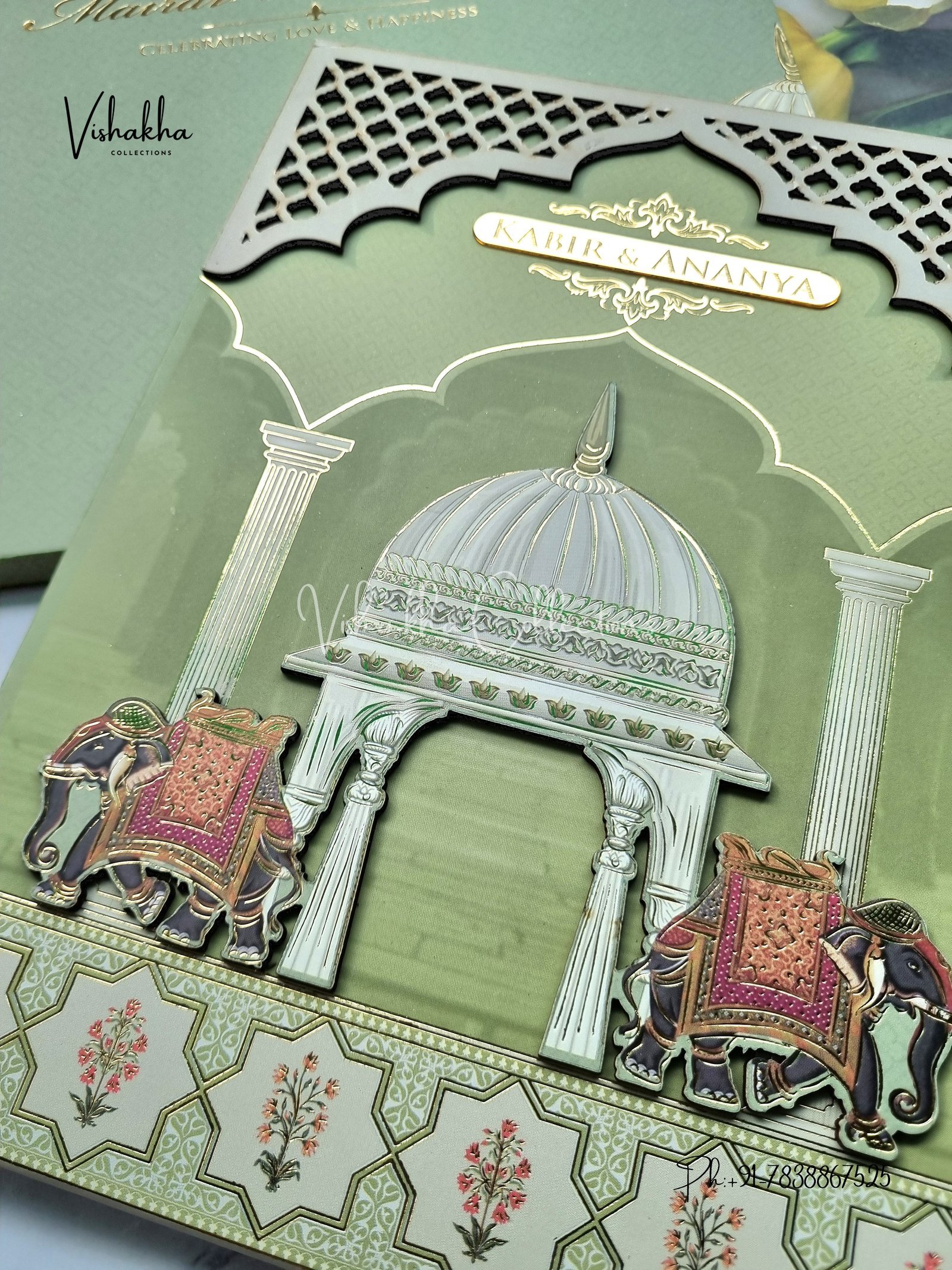 Hathi Hindu Muslim Christian Sikh Padded MDF Board Laser Cut light green Colored invitation Cards SK-3404