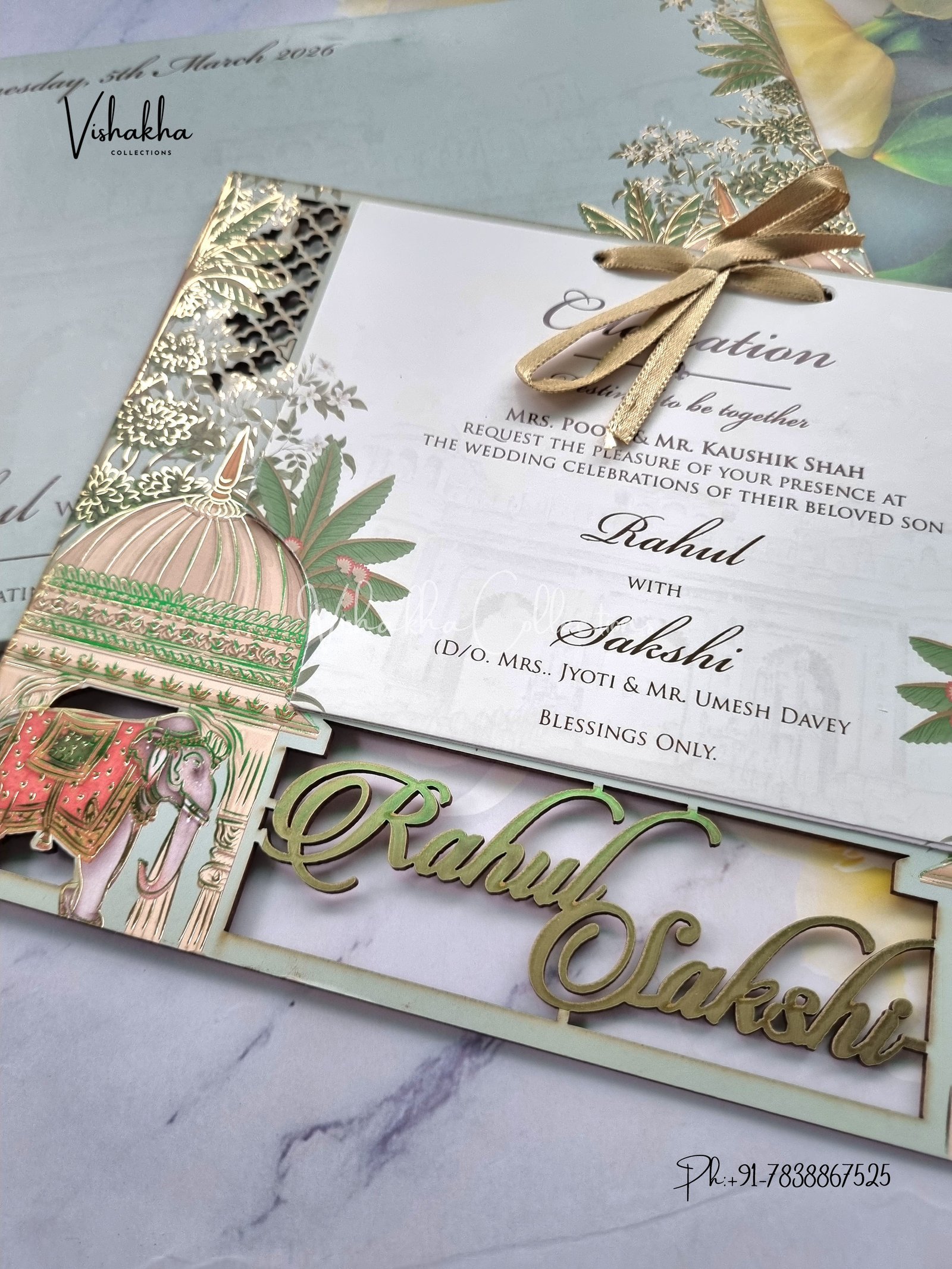 Semi Box Hathi Hindu Muslim Christian Sikh Named MDF Laser Cut light green Colored invitation Cards SK-3357