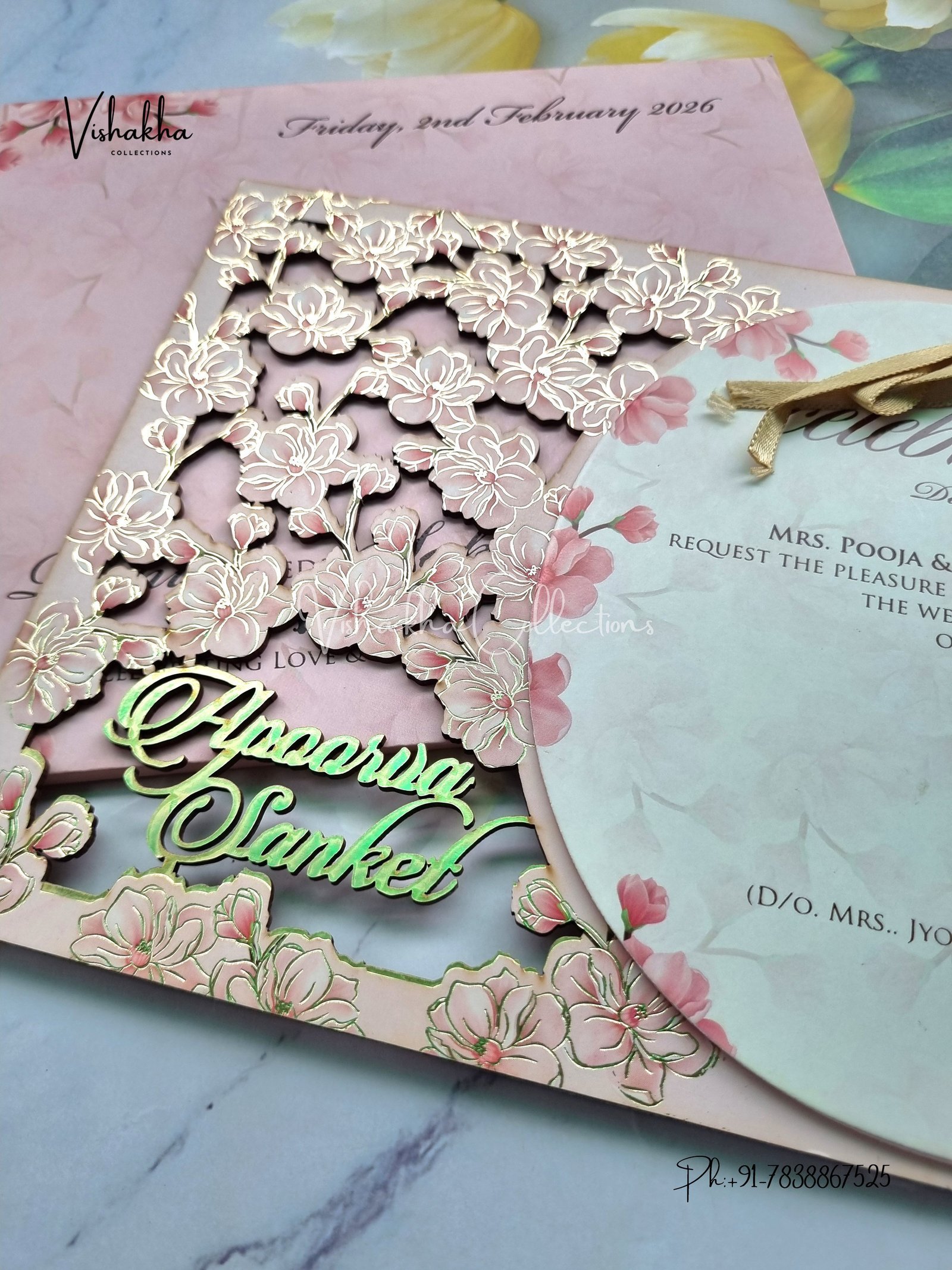 Semi Box Flower Hindu Muslim Christian Sikh Named MDF Laser Cut pink Colored invitation Cards SK-3285