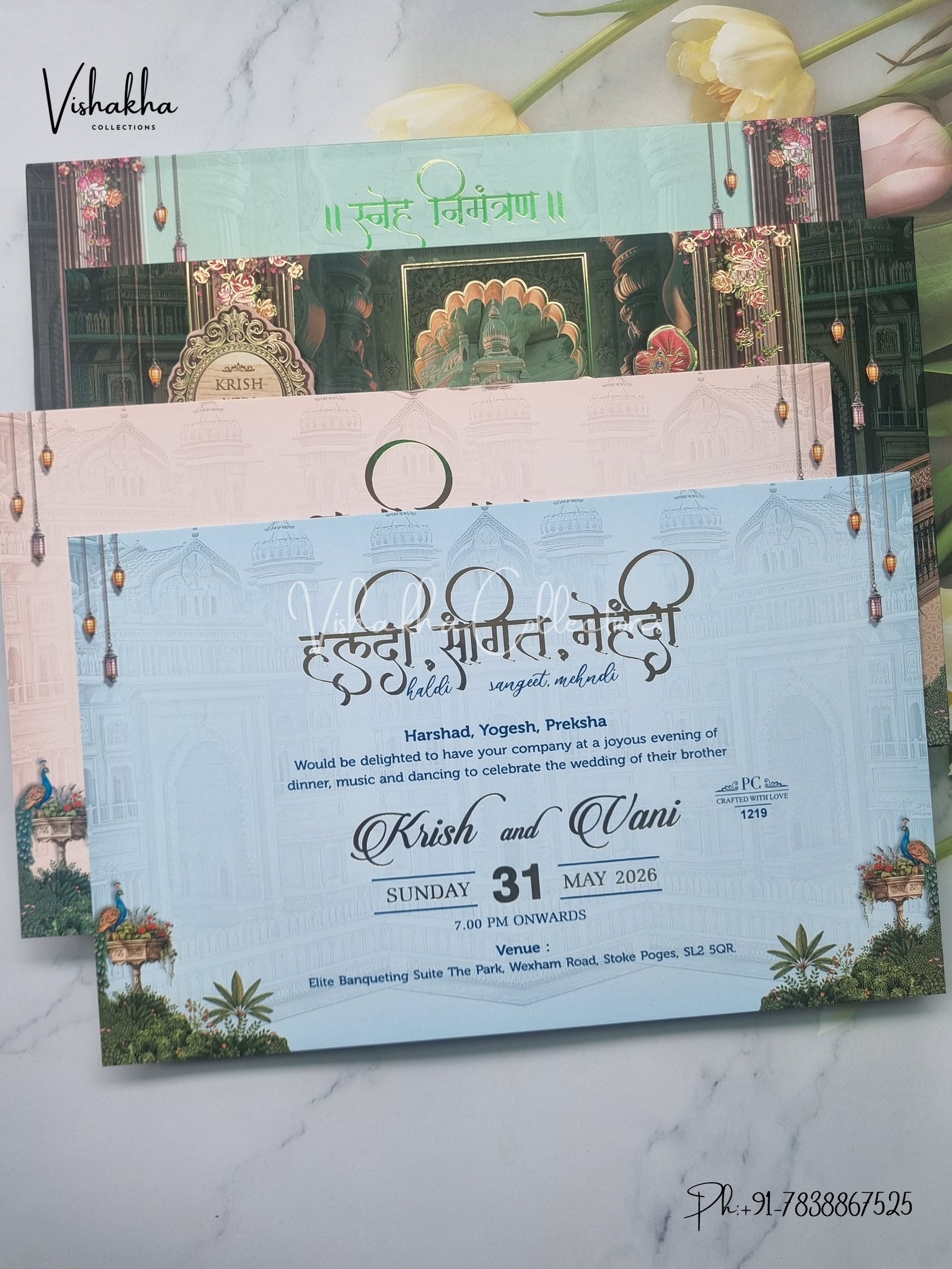 Vishakha Collections presents you beautiful luxury wedding invitation cards with all latest designs and the latest variety. Its just not a wedding invitation card but a beautiful feeling of love and relationship it carries for you. Beautifully printed and packed with a bundle of love. if you like it, dont think again, just go for it.If you are worrying about the quality of the product, send your doubts to us. We are here to help you. If you want in wholesale or bulk, dont forget to contact us.