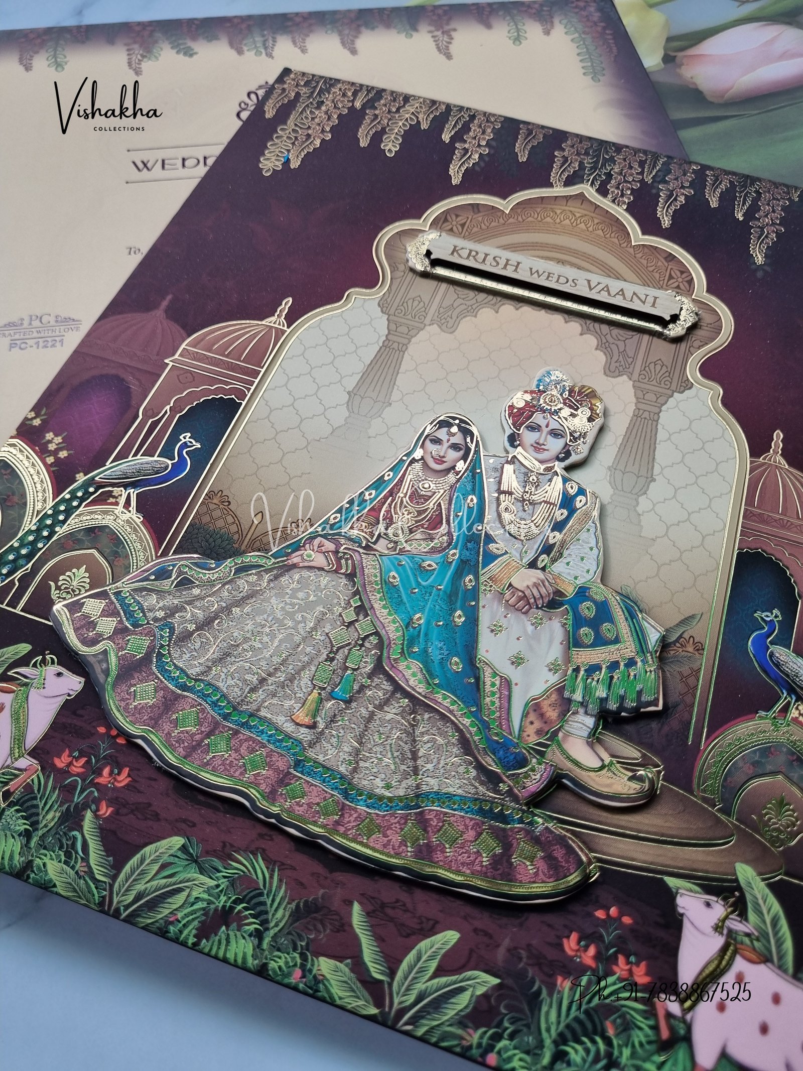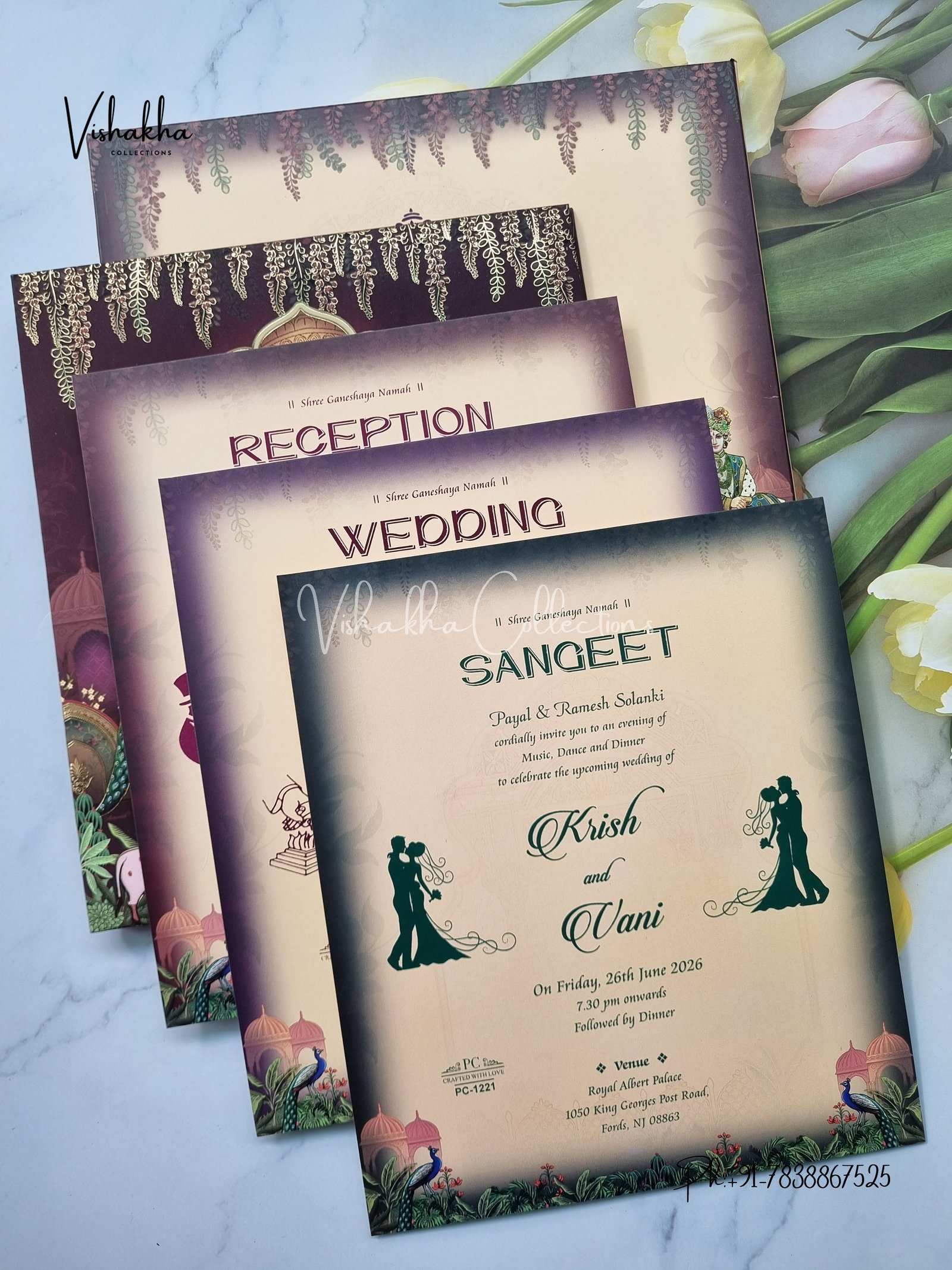Vishakha Collections presents you beautiful luxury wedding invitation cards with all latest designs and the latest variety. Its just not a wedding invitation card but a beautiful feeling of love and relationship it carries for you. Beautifully printed and packed with a bundle of love. if you like it, dont think again, just go for it.If you are worrying about the quality of the product, send your doubts to us. We are here to help you. If you want in wholesale or bulk, dont forget to contact us.