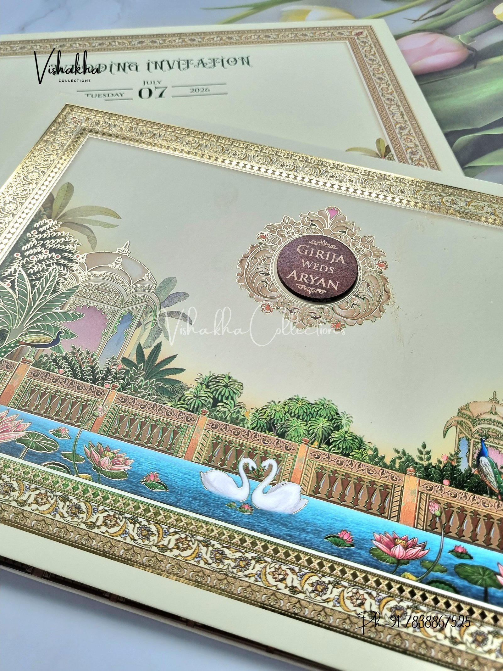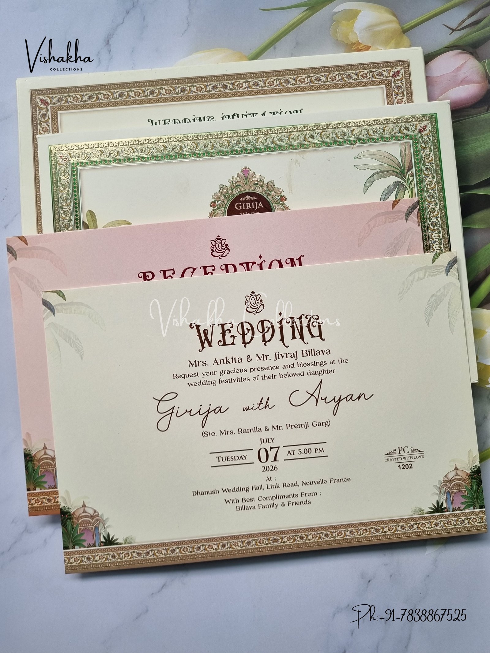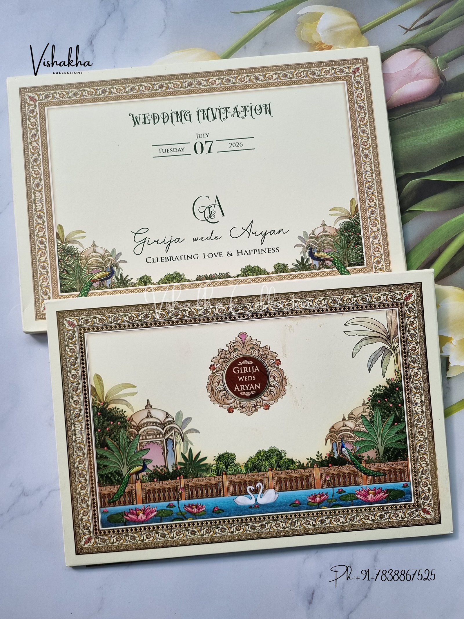 Vishakha Collections presents you beautiful luxury wedding invitation cards with all latest designs and the latest variety. Its just not a wedding invitation card but a beautiful feeling of love and relationship it carries for you. Beautifully printed and packed with a bundle of love. if you like it, dont think again, just go for it.If you are worrying about the quality of the product, send your doubts to us. We are here to help you. If you want in wholesale or bulk, dont forget to contact us.