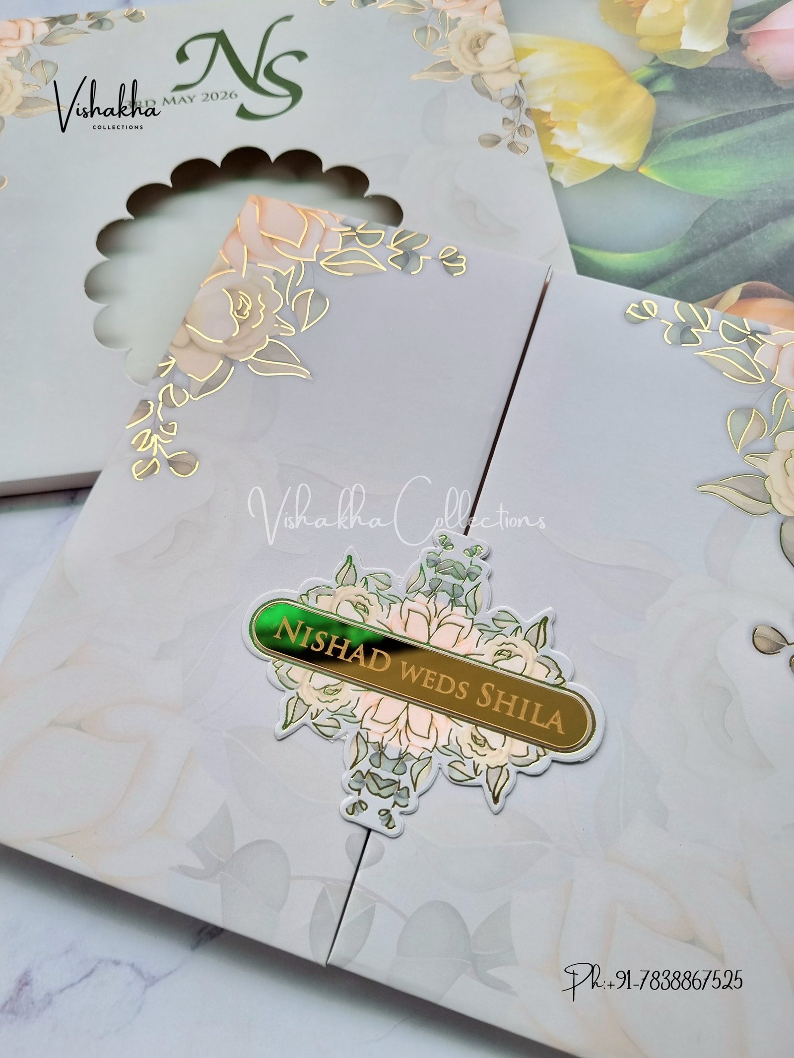 Vishakha Collections presents you beautiful luxury wedding invitation cards with all latest designs and the latest variety. Its just not a wedding invitation card but a beautiful feeling of love and relationship it carries for you. Beautifully printed and packed with a bundle of love. if you like it, dont think again, just go for it.If you are worrying about the quality of the product, send your doubts to us. We are here to help you. If you want in wholesale or bulk, dont forget to contact us.